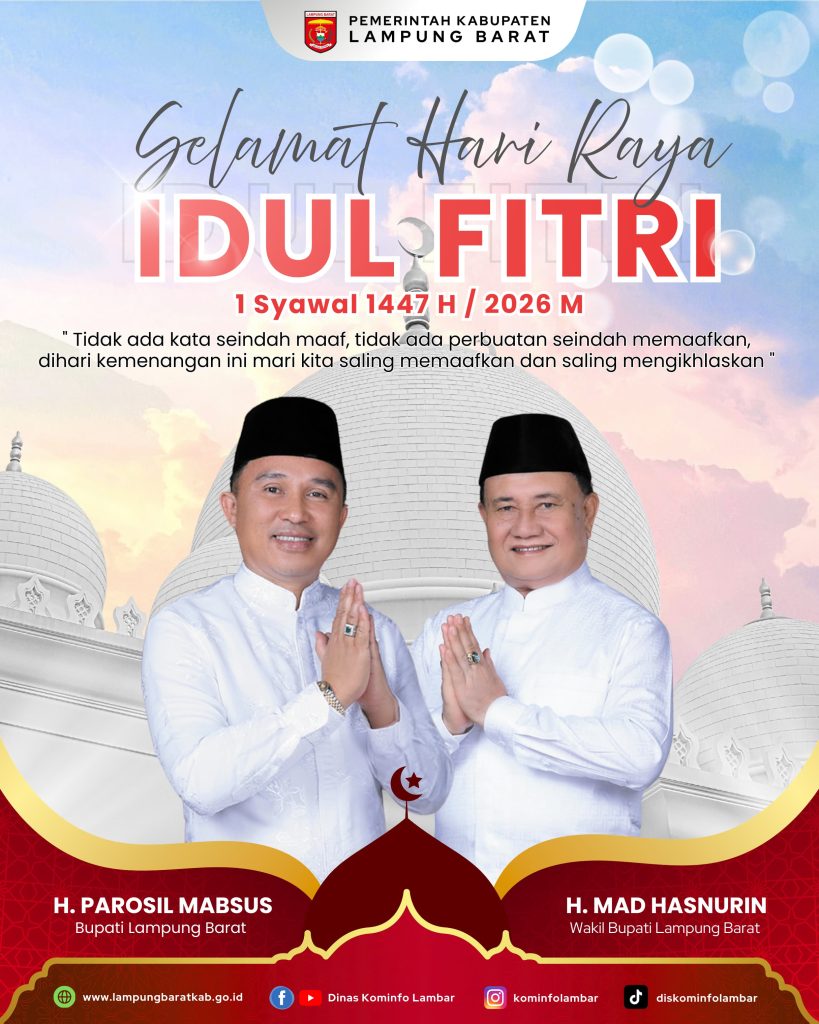 Lampung Barat — Bupati Lampung Barat Hi. Parosil Mabsus bersama Wakil Bupati Drs. Mat Hasnurin menyampaikan ucapan selamat Hari Raya Idul Fitri 1447 Hijriyah kepada seluruh masyarakat, khususnya umat Muslim di Lampung Barat.