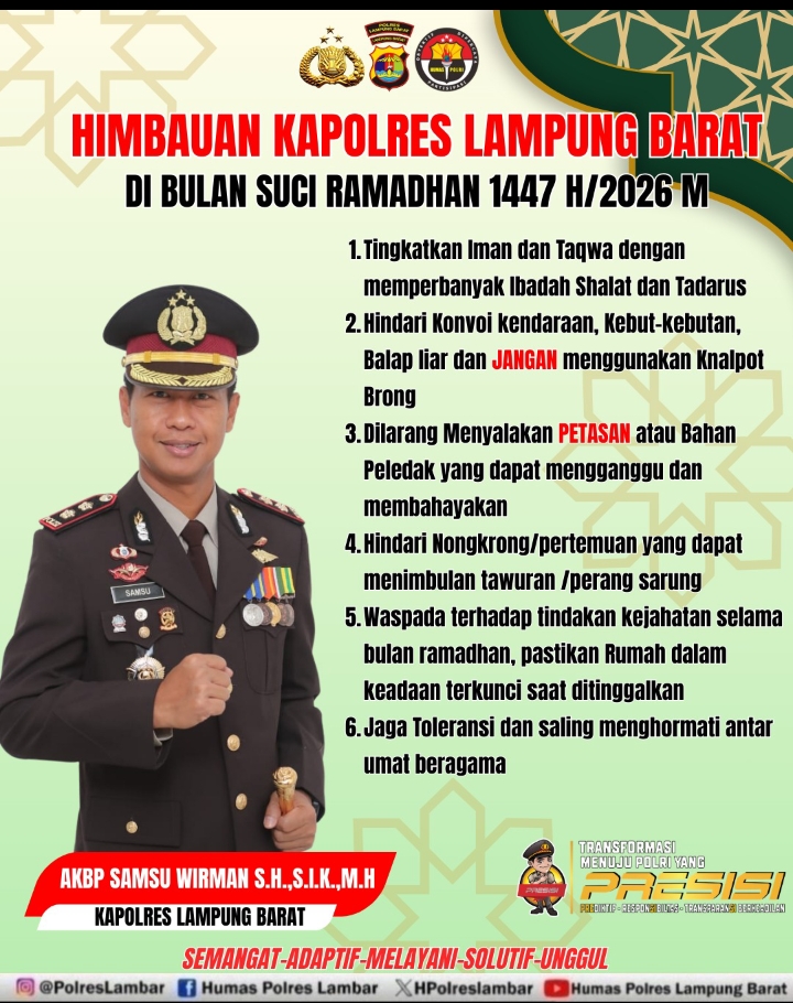 Lampung Barat –Dalam rangka menyambut bulan suci Ramadhan 1447 Hijriyah, Kapolres Lampung Barat, AKBP Samsu Wirman S.H., S.I.K., M.H., mengimbau seluruh masyarakat untuk bersama-sama menjaga keamanan dan ketertiban masyarakat (kamtibmas) agar tetap kondusif selama bulan Ramadhan 1447 Hijriyah yang penuh berkah ini. Kapolres menyampaikan bahwa Ramadhan merupakan momentum untuk meningkatkan keimanan dan ketakwaan kepada Allah […]