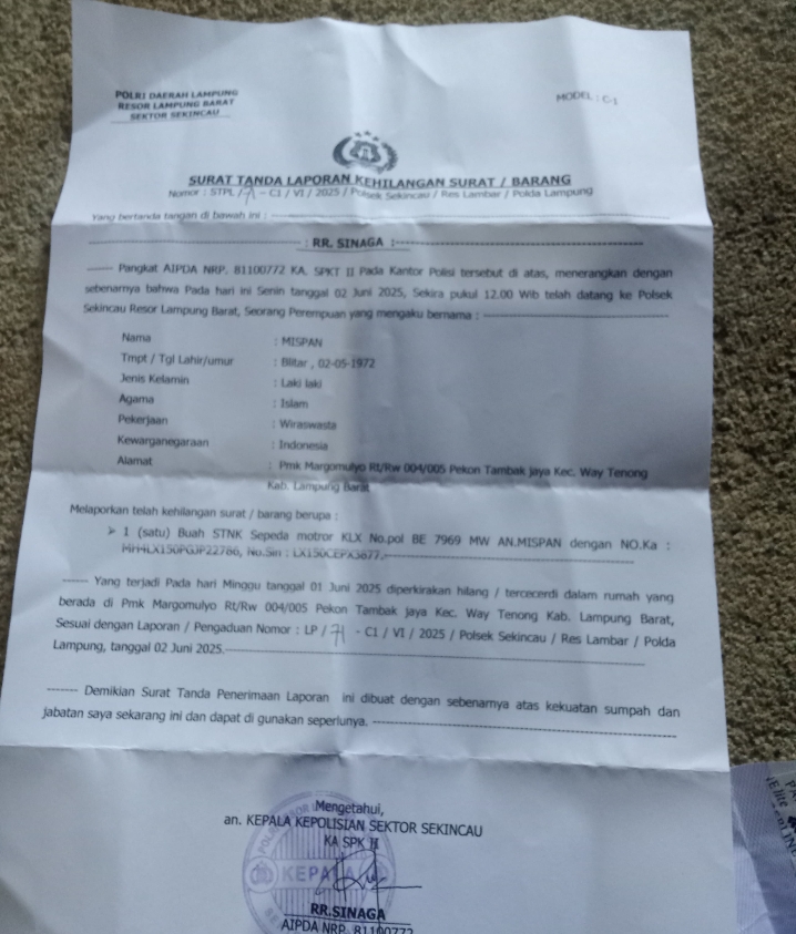 STNK Motor Hilang, Mispan Lapor Ke Polsek Sekincau.