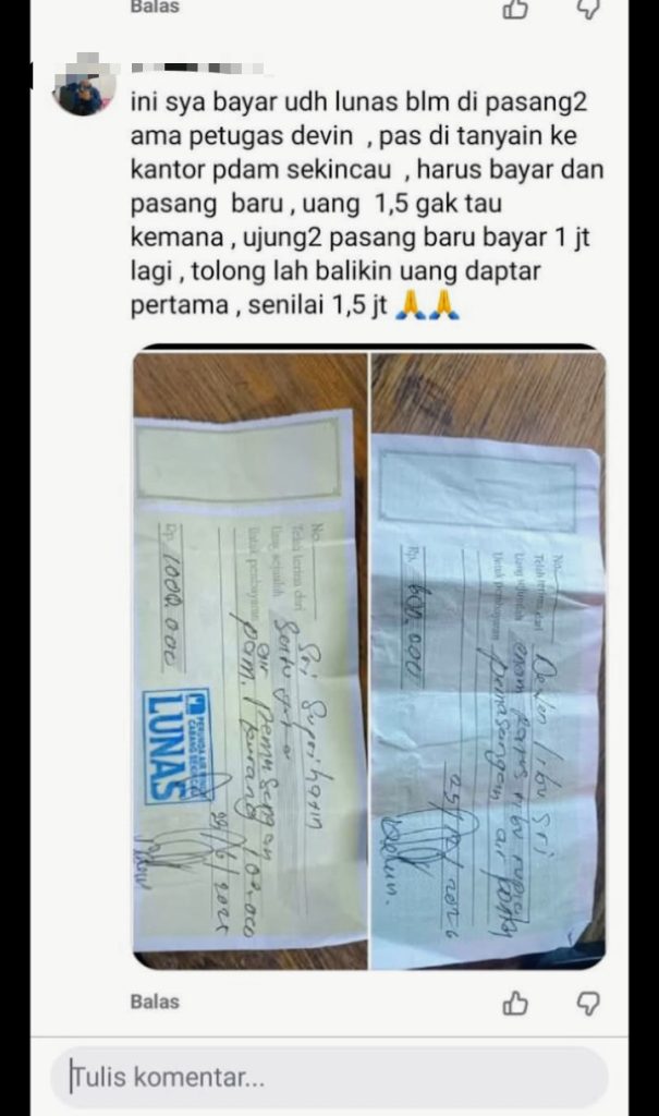 Lampung Barat – Seorang konsumen Perusahaan Daerah Air Minum (PDAM) Limau Kunci, Deni, warga Lingkungan Kebas, Kelurahan Sekincau, mengeluhkan dugaan pembayaran ganda dalam proses pemasangan sambungan air bersih.