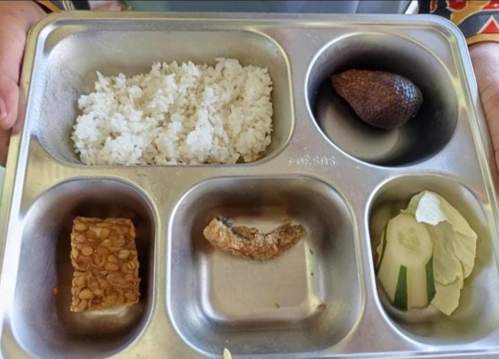 Dalam gambar tersebut memperlihatkan nampan stainless steel berisi nasi putih secukupnya, sepotong tempe goreng kecil, irisan daging yang sangat minim , timun dan selada mentah sebagai sayuran, serta satu biji salak utuh sebagai buah.
